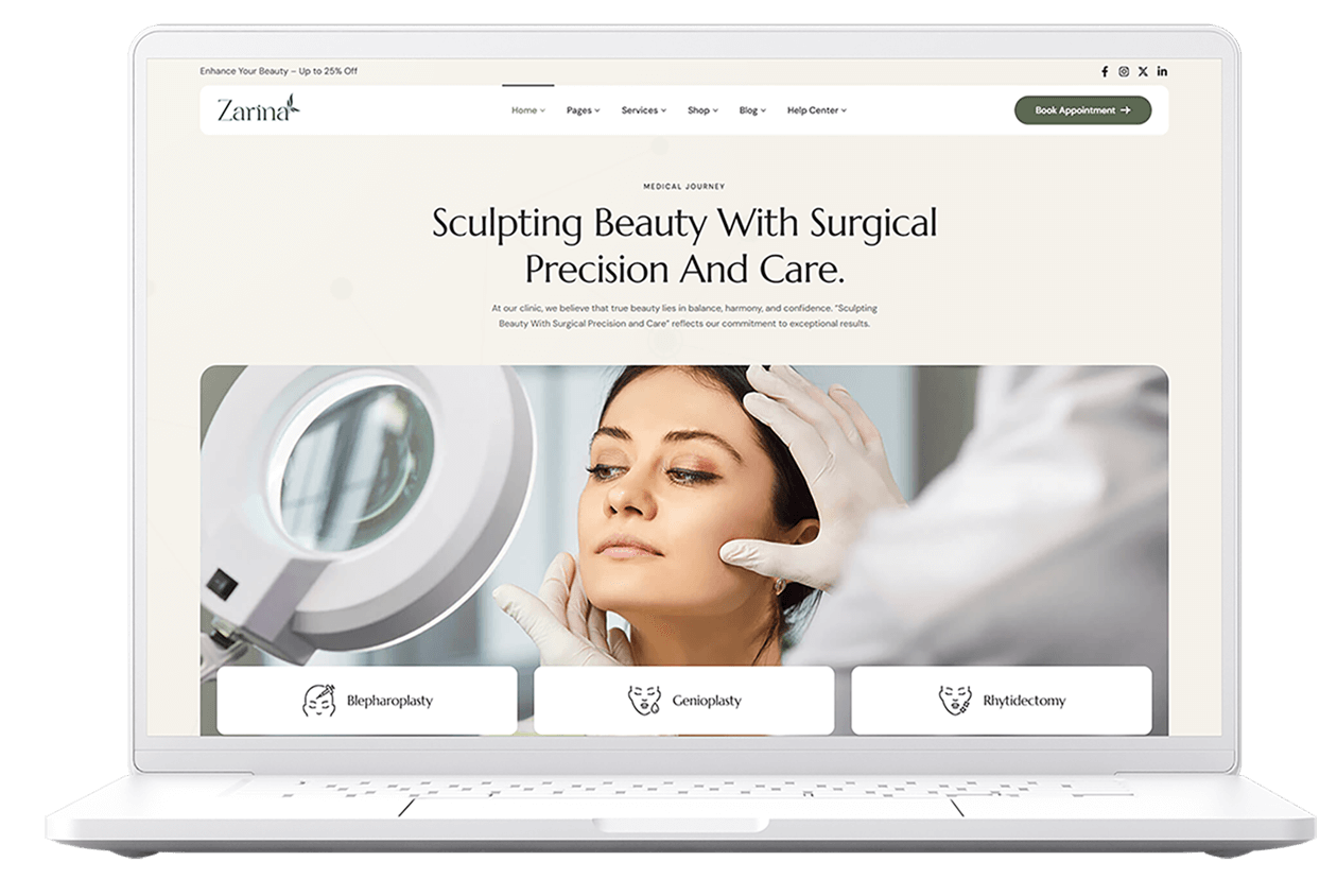 Zarina This theme is perfect for building professional websites in the beauty and wellness industry, including plastic surgery clinics, skin care centers, and skin enhancement studios.